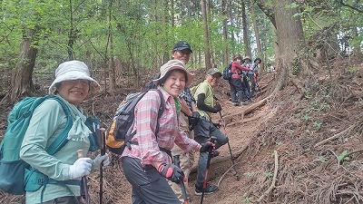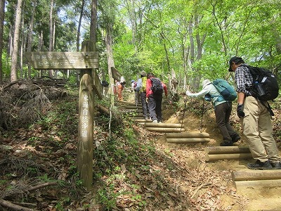 階段、根っ子有り、歩きづらいが新緑が気持ち良い